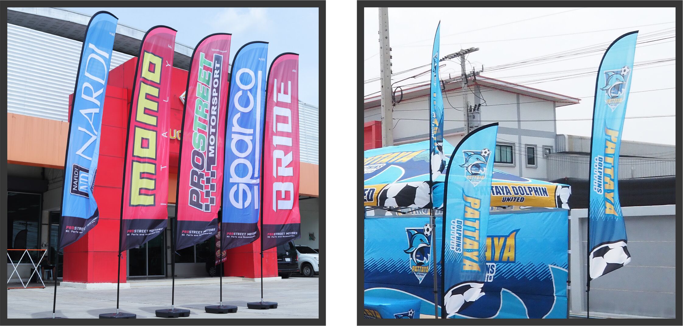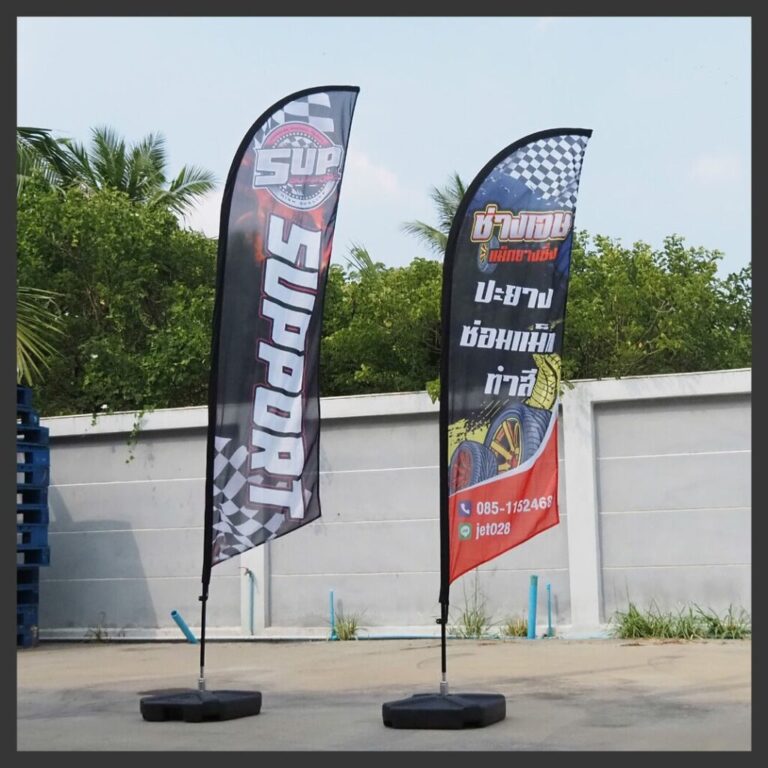 Beach Flag เหมาะกับ: หน้าร้าน บูธขายของ งานอีเว้นท์ งานวิ่ง/กีฬา โรงแรม-รีสอร์ท โครงการอสังหา งานแต่งงาน และธุรกิจทุกประเภทที่ต้องการโฆษณากลางแจ้ง